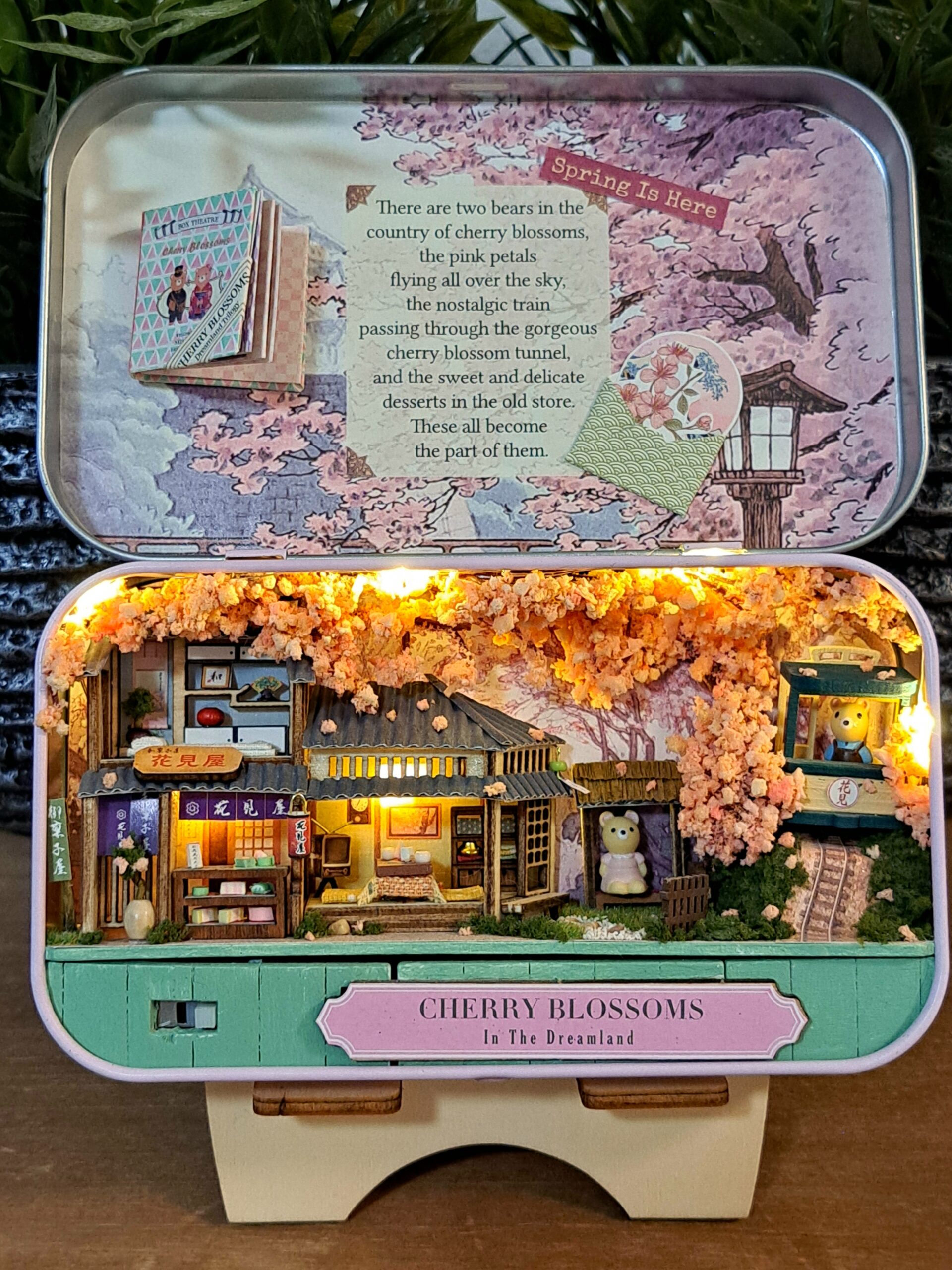 Miniatuur huisje met kersenbloesem in een blikje, inclusief ledlichtjes, handgemaakt, inclusief standaard. Het blikje kan dicht. Schaal: 1:48. (Niet geschikt voor kinderen). Afmetingen: 14.3cm x 8.4cm x 2.6cm (als het blikje dicht is)