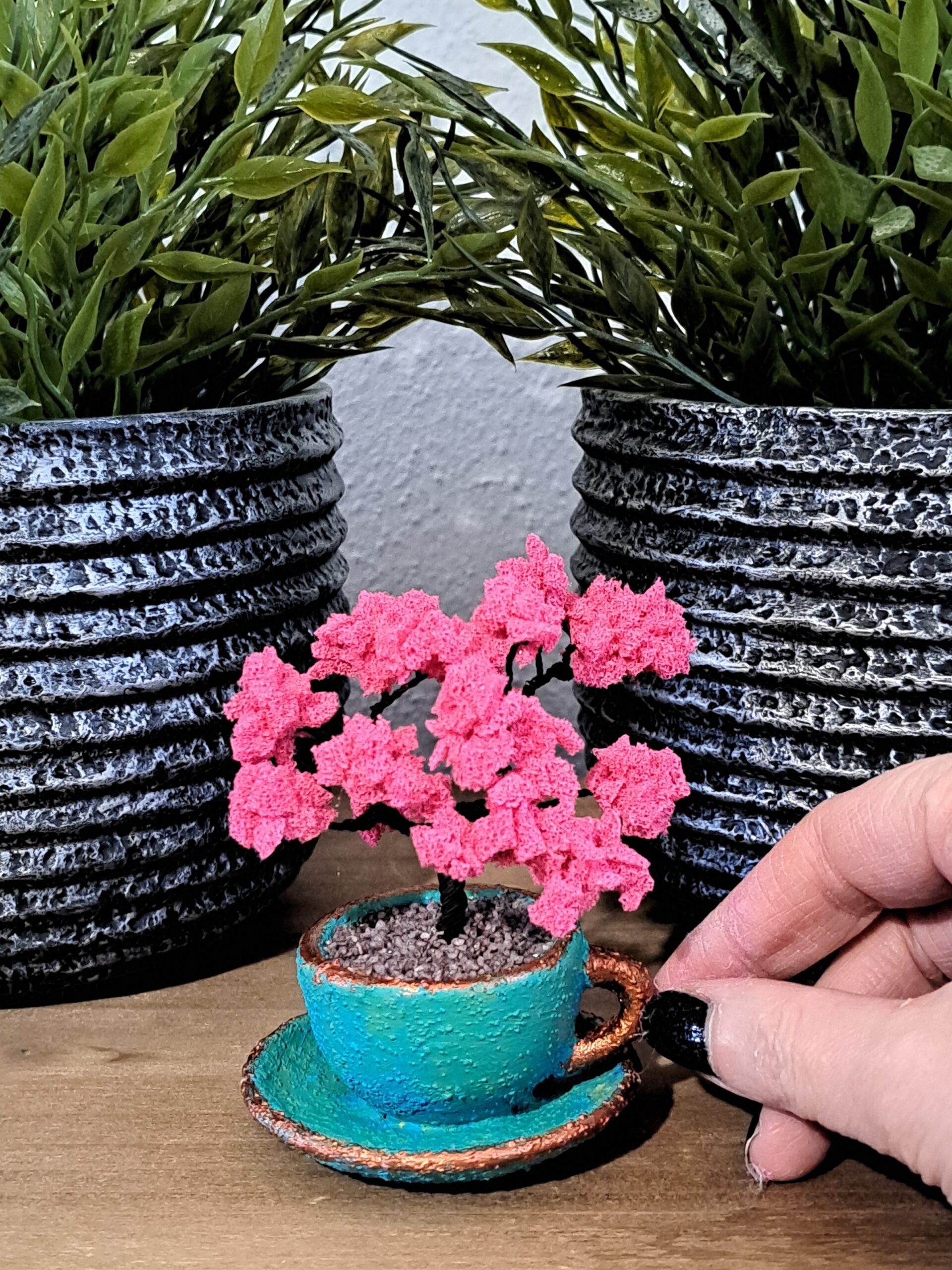 Miniatuur kersenbloesem bonsai in een theekopje. Afmetingen: 6cm x 10cm.