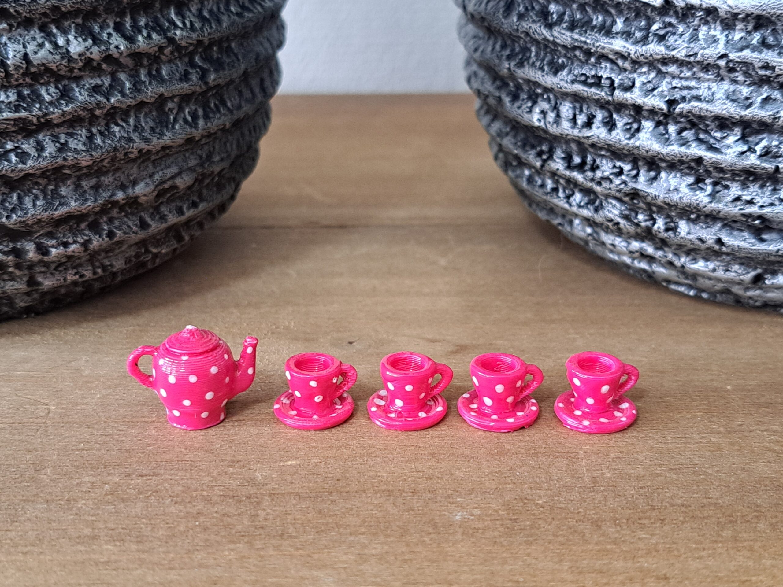 Miniatuur theeset roze, schaal 1:24.Hoogte theepotje 1,5 cm.Hoogte kop en schotels 0,8cm.Schoteltjes zitten vast aan de kopjes. Deksel van de theepot zit ook vast.
