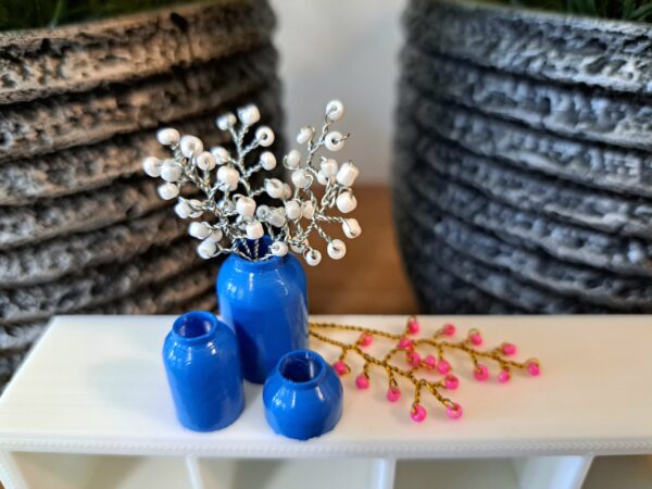 3 Vaasjes met 5 handgemaakte decoratie takken, schaal 1:12.Hoogste vaas 2cm, met takken 4.5cm. De wit/zilveren takken staan er los in.