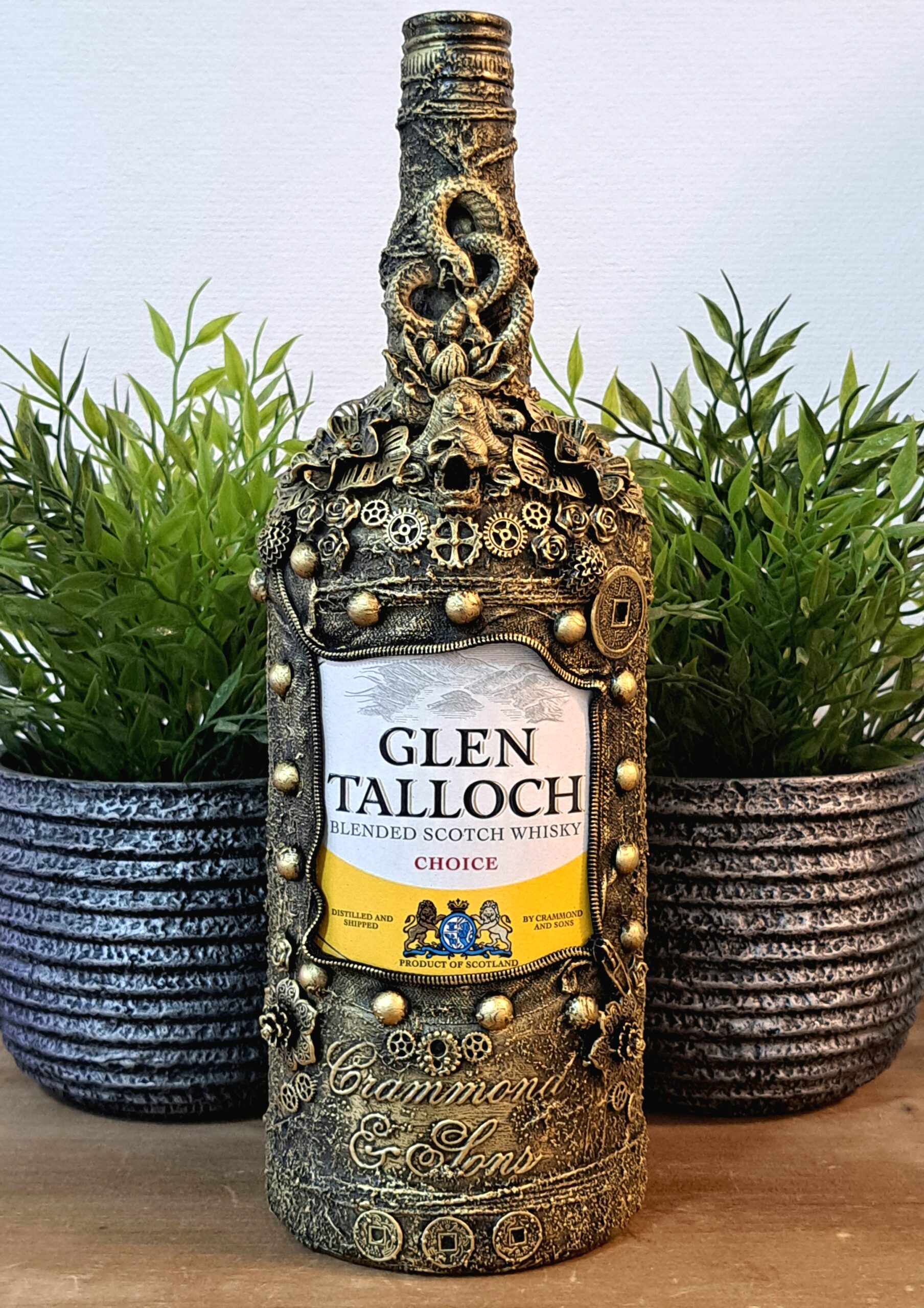 Steampunk bewerkte (lege) Glen Talloch fles, 1.5L, hoogte 34cm, dop zit los.