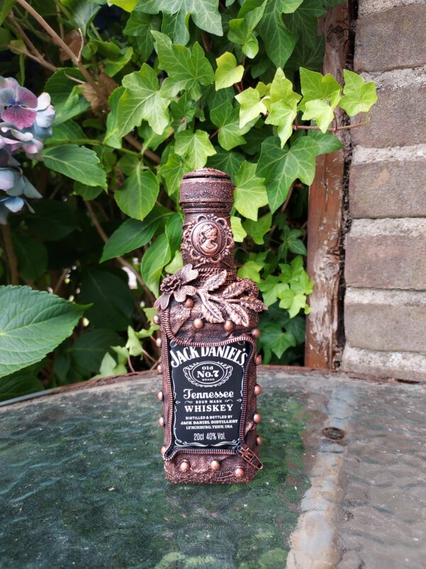 Steampunk bewerkte (lege) Jack Daniels fles, hoogte 18cm (20cl). De fles is navulbaar.